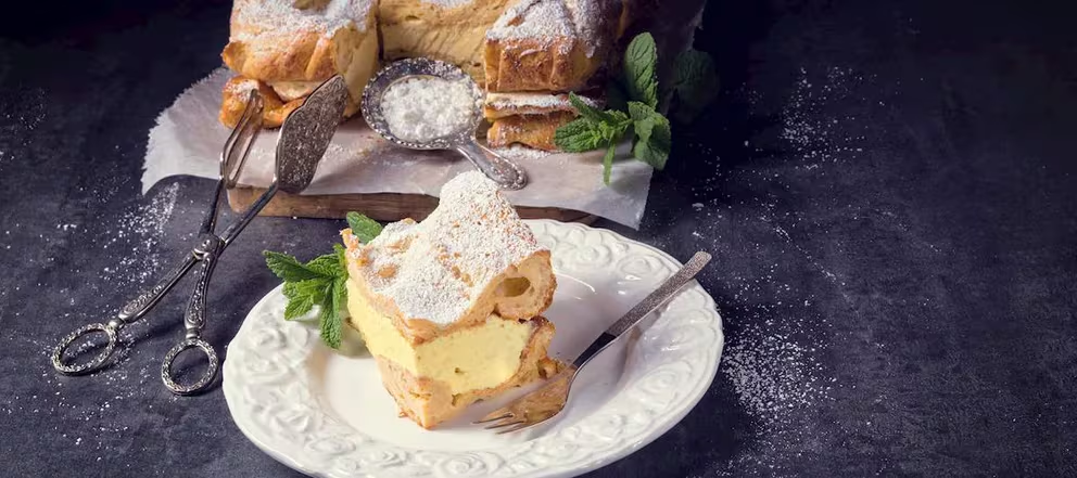 La karpatka, un postre polaco compuesto de dos capas de pâte à choux y una capa de crema pastelera de vainilla